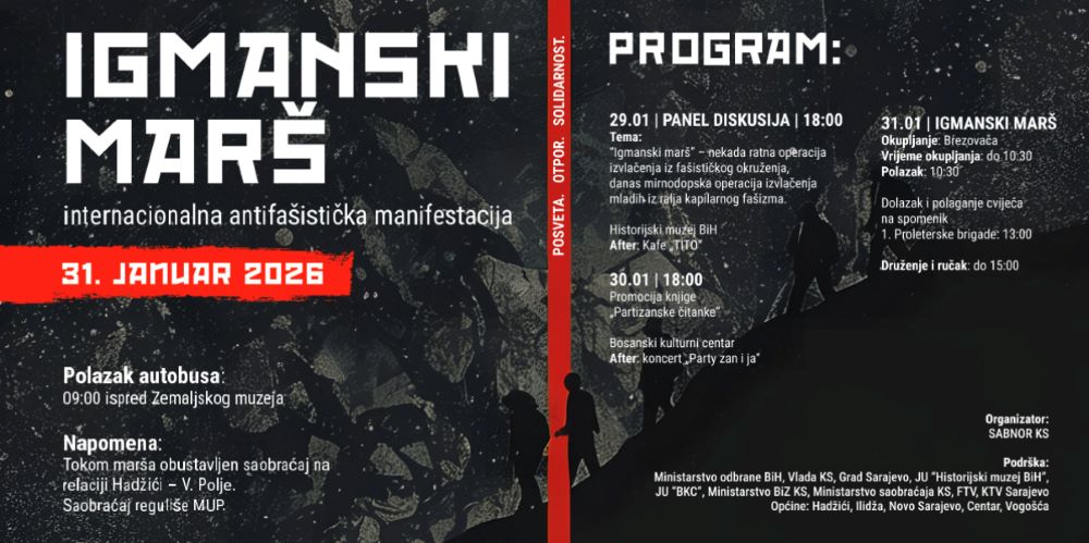 29. januara od 18:00 u Historijskom muzeju Bosne i Hercegovine biće upriličena panel diskusija „Igmanski marš – nekada ratna operacija izvlačenja iz fašističkog okruženja, danas mirnodopska operacija izvlačenja mladih iz kapilarnog fašizma“.
