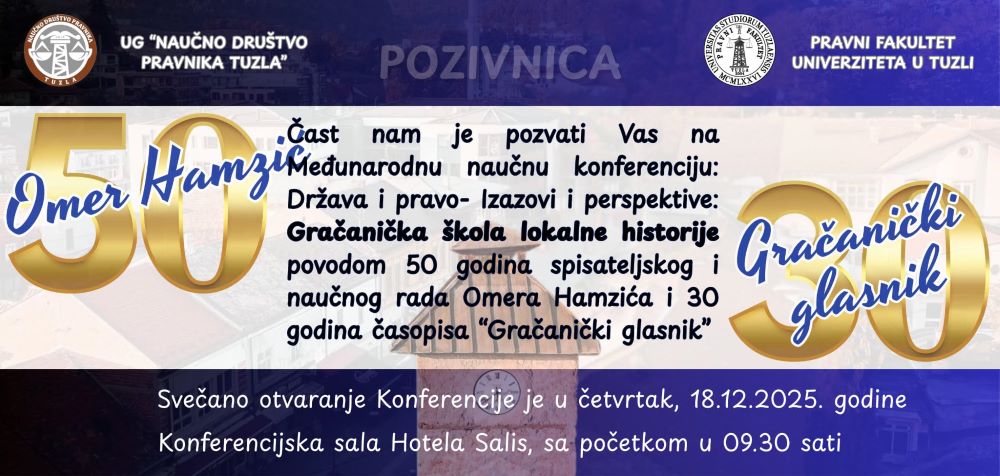 Sutra, 18. decembra 2025. godine, u Tuzli, u Hotelu Salis, sa početkom u 9:30 sati, bit će održana Međunarodna naučna konferencija „Država i pravo – izazovi i perspektive: Gračanička škola lokalne historije“.