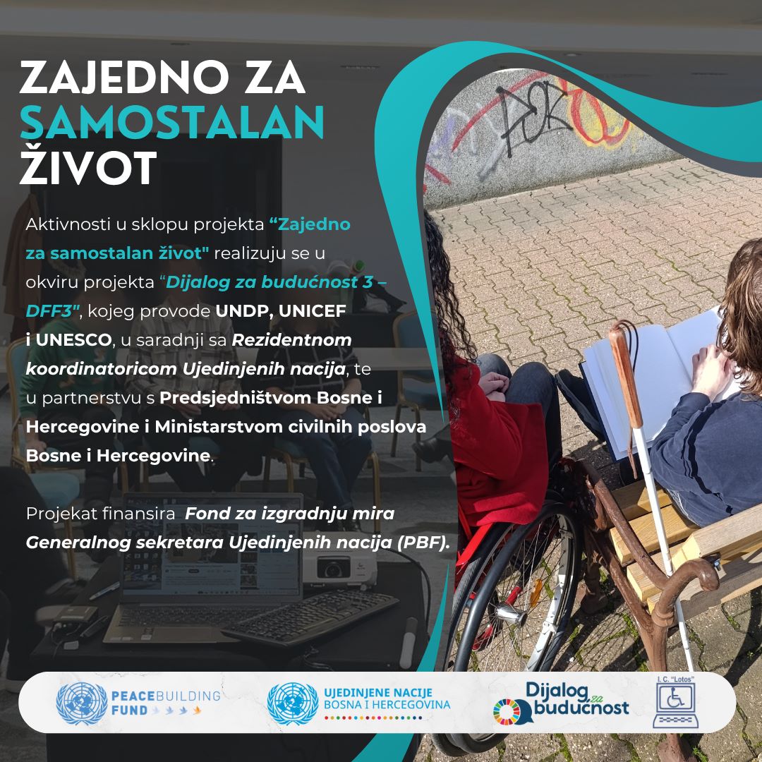 Aktivnosti u okviru projekta: „Zajedno za samostalan život“ realizuju se u sklopu projekta Dijalog za budućnost 3 (DFF3), kojeg provode UNDP, UNICEF i UNESCO, u saradnji sa Rezidentnom koordinatoricom Ujedinjenih nacija, te u partnerstvu s Predsjedništvom Bosne i Hercegovine i Ministarstvom civilnih poslova Bosne i Hercegovine. Projekat finansira Fond za izgradnju mira Generalnog sekretara Ujedinjenih nacija (PBF).