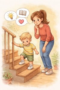 Dijete je nakon nekoliko trenutaka uspjelo sići. Okrenulo se i nasmijalo. Ne zato što je savladalo stepenice, već zato što je osjetilo da može, da ga je majka nosila, dijete bi bilo sigurno, ali ne bi steklo iskustvo samostalnosti.
